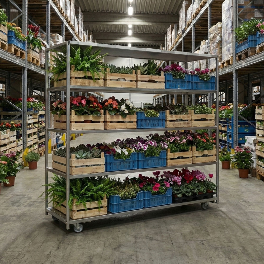 Afhankelijk van de toepassing ontwerpen wij rolkarren met meerdere niveaus voor trays, verstelbare schappen of specifieke vakindelingen voor potten en plantenbakken. Zo sluit elke oplossing aan op uw teelt- en verwerkingsproces.